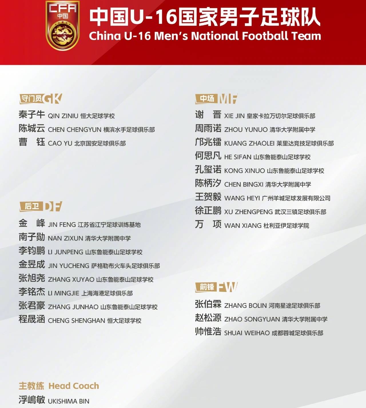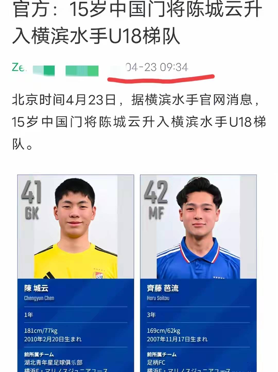 5,陈城云(10年),现效力日本J联赛豪门横滨水手U18A队,参加日本U18一级(顶级)联赛。