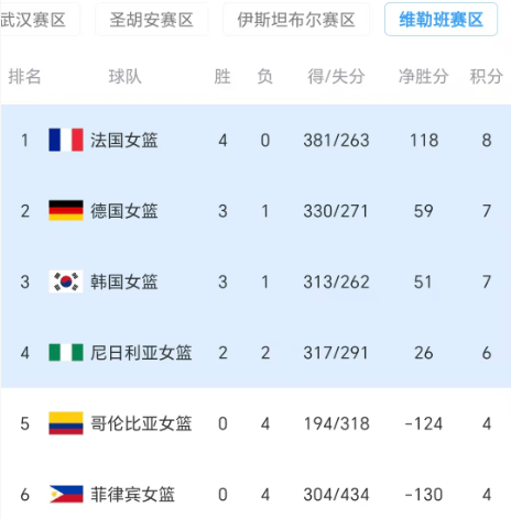 菲律宾队被分到了维勒班赛区,跟德国队、法国队、韩国队、尼日利亚队、哥伦比亚队同组,结果连输四场,比分分别为66-115法国队、80-113德国队、84-101尼日利亚队、74-105韩国队,狂输130分,沦为小组垫底位置,已经提前一轮出局,成为第一支被淘汰的亚洲球队。