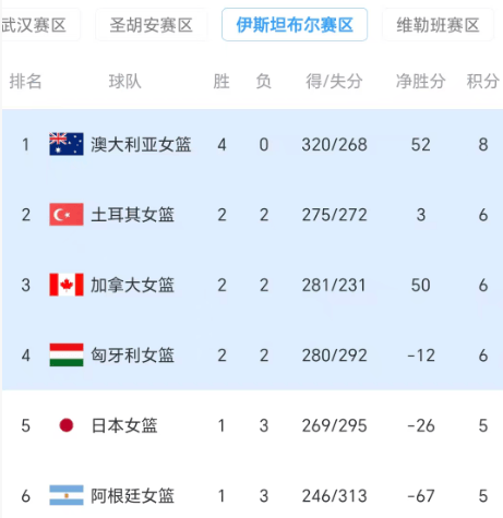 除了菲律宾队之外,日本队也是非常接近出局,因为前三轮连输匈牙利队、澳大利亚队、土耳其队,连续被翻盘遭遇开局三连败,一度沦为小组垫底,直到第四轮顶住压力,以66-62险胜加拿大队,拿下生死战的胜利,同时反超阿根廷队,暂时升至小组第五,保留晋级世界杯的希望。